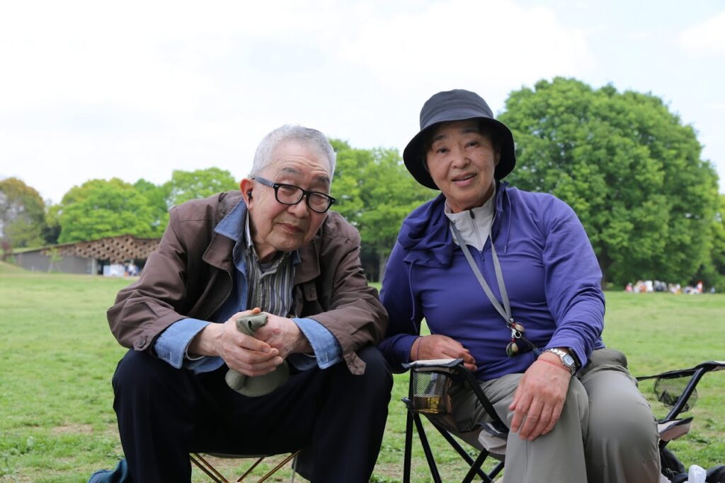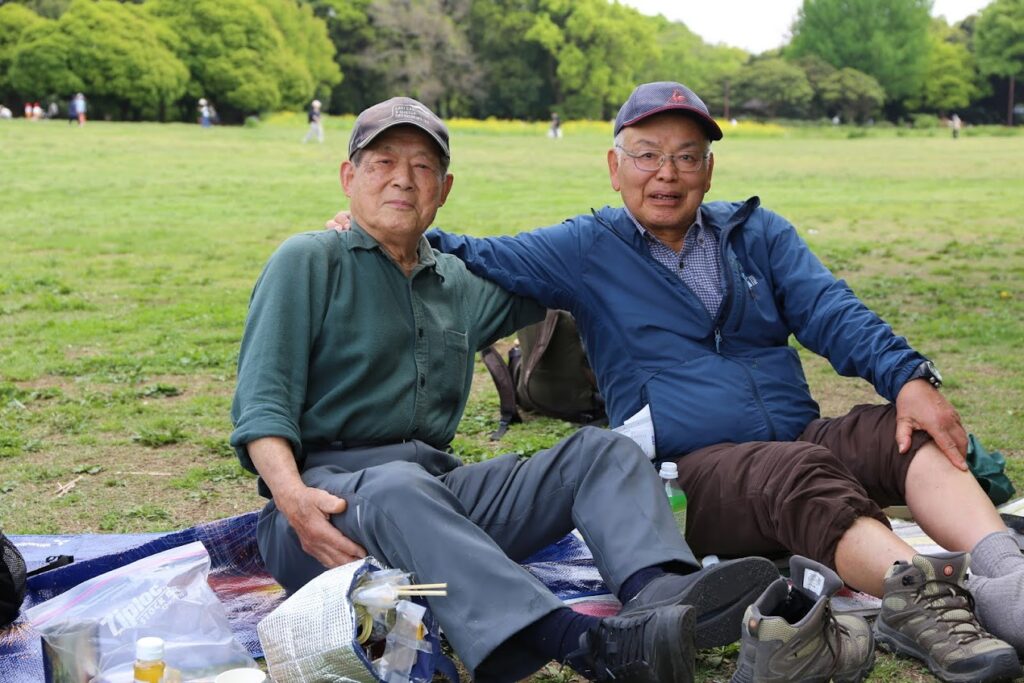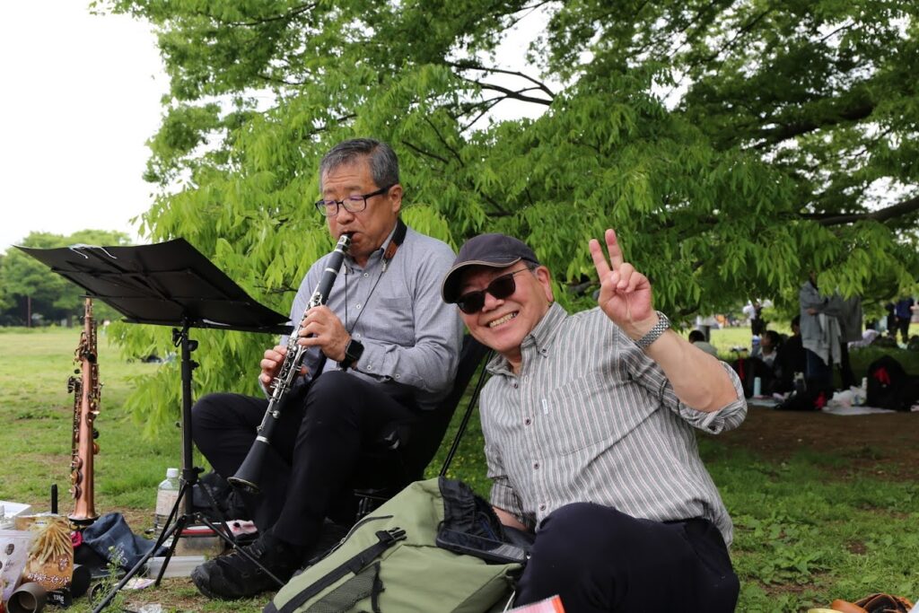 各自手持ちの昼食や飲物で歓談、恒例の芝田さんのフルートやサックス演奏が始まると、隣のグループの女子中学生が、演奏を聞かせてもらっていいですかと恐るおそる声をかけてきた。えっとうれしい戸惑い。都合が悪いわけがない。演奏者の芝田さんはじめ、がぜん、皆の心が弾んだ。都内の中学校の郊外学習で、みなさん中学2年生で、13/14歳とのこと。こちらは全員70歳台、80歳台で歳の差60歳から70歳。今までと比べて参加者少な目で少し寂しかったけれど、人生これからという若人と思いもかけず交流ができ、みな少し幸せな気分になれた。佐野さんの一句「老年が少年となる昭和の日」