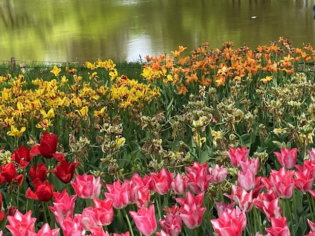 昼食歓談後、皆で園内散策したが、今年は4月の気温が低かったせいか、昨年より花の開花がおそく、こもれびの丘はネモフィラの開花は遅れていてまだ緑だった。西立川口近くの渓流広場はチューリップが見頃だった。日本庭園など散策して、あけぼの口を午後3時過ぎに退出。立川駅南口の「鳥いちず」で二つのテーブルに別れ、生ビールと鳥料理で乾杯し、約2時間後立川駅で解散して各々の家路についた。