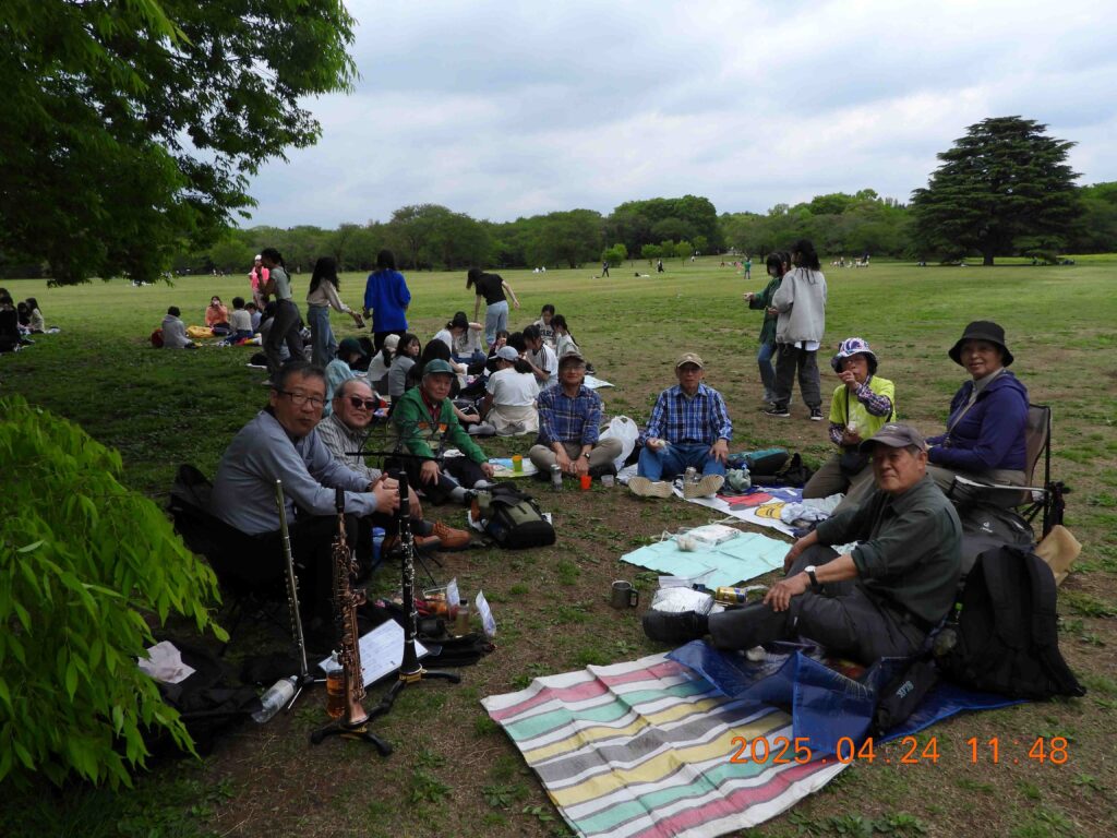各自手持ちの昼食や飲物で歓談、恒例の芝田さんのフルートやサックス演奏が始まると、隣のグループの女子中学生が、演奏を聞かせてもらっていいですかと恐るおそる声をかけてきた。えっとうれしい戸惑い。都合が悪いわけがない。演奏者の芝田さんはじめ、がぜん、皆の心が弾んだ。都内の中学校の郊外学習で、みなさん中学2年生で、13/14歳とのこと。こちらは全員70歳台、80歳台で歳の差60歳から70歳。今までと比べて参加者少な目で少し寂しかったけれど、人生これからという若人と思いもかけず交流ができ、みな少し幸せな気分になれた。佐野さんの一句「老年が少年となる昭和の日」