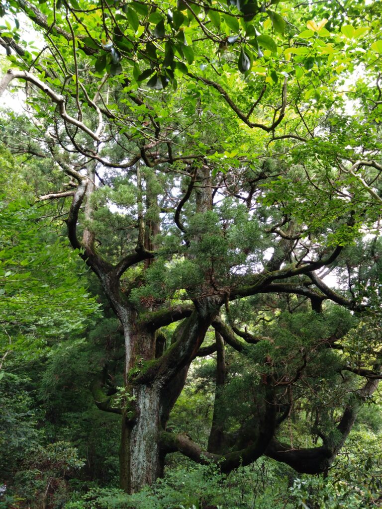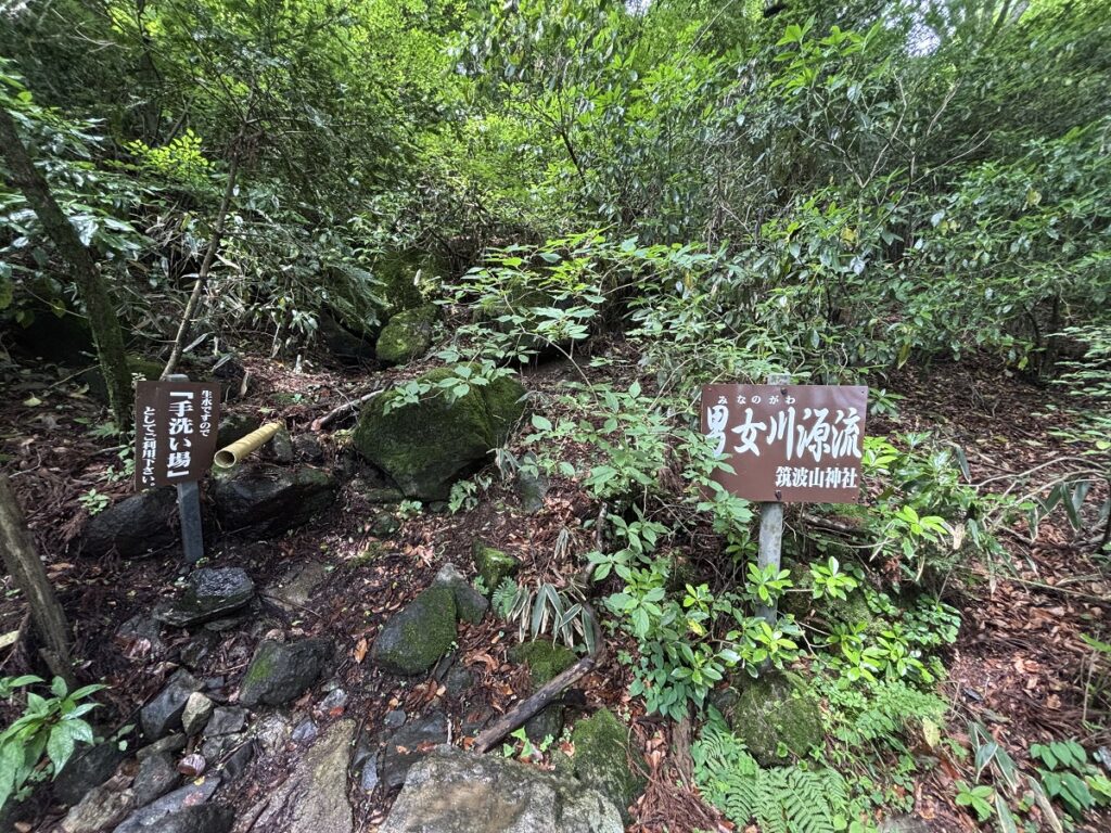 この時点ですでに15分遅れ、御幸ヶ原に着くころには男体山(871m)に登る時間が厳しくなり、コースカットしました。そのかわり、パワースポットとして有名な御幸ヶ原から徒歩一分の「男女川(みなのがわ)源流と紫峰杉」を見に行きました。源流の隣にそびえ立つ巨大な杉の木は、高さ約40m、幹回り7m、推定樹齢800年。筑波山自体が筑波山神社のご神体でありご神体の中にある杉の木にもパワーを感じます。ちなみに男体山は伊弉諾尊(いざなぎのみこと)、女体山は伊弉冉尊(いざなみのみこと)を祀っています。また男女川源流は百人一首の陽成院のロマンチックな和歌、「筑波嶺(つくばね)の 峰より落つる男女川 恋ぞつもりて 淵となりぬる」の『峰より落つる男女川』の場所です。