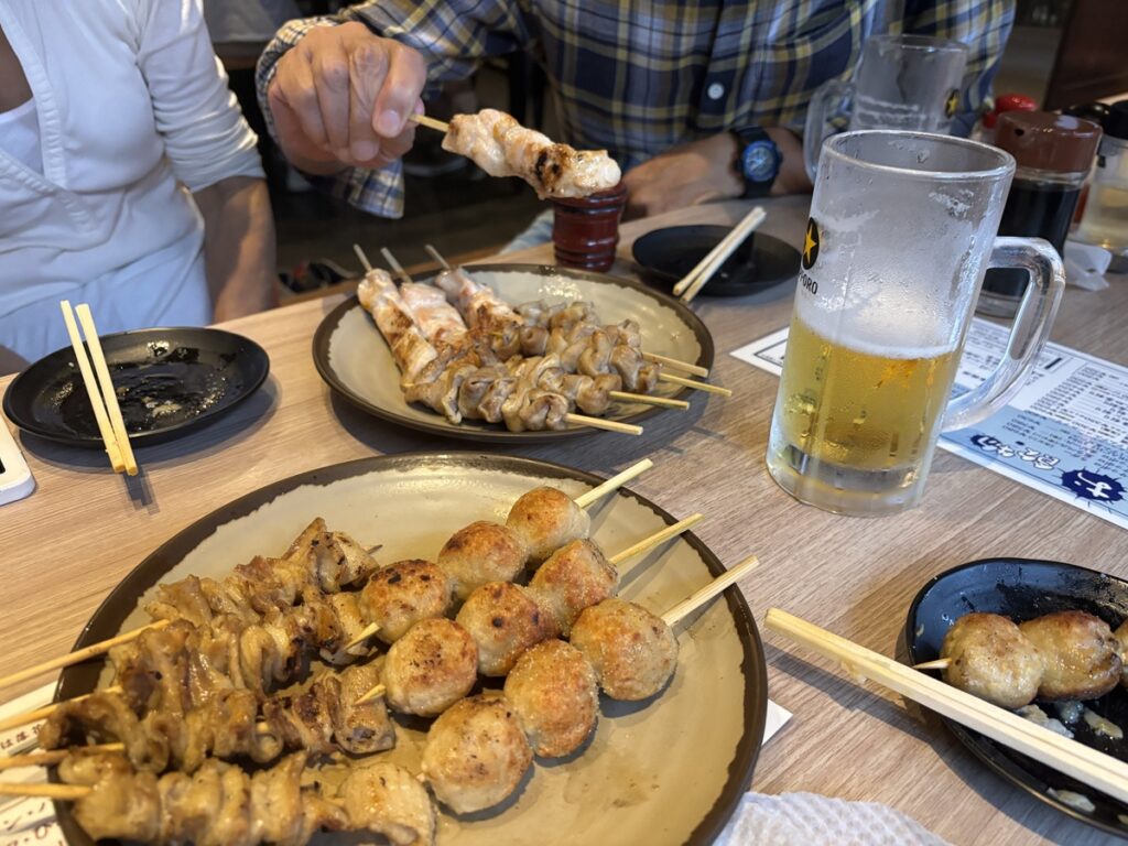 です。先に到着したバス組に席を取って貰い、やきとりとジャンボシューマイをあてに