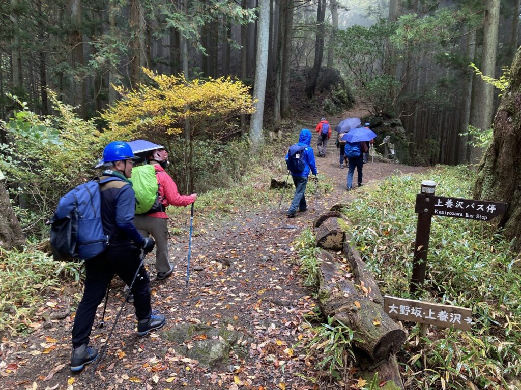出発後、間もなくして小雨が降り出し、カッパや傘を差しての縦走です。日の出町はご存じのように都内では熊出没件数が多いので熊鈴やヘルメットで熊対策をしています。佐野は、熊よけスプレーを腰にぶら下げています。