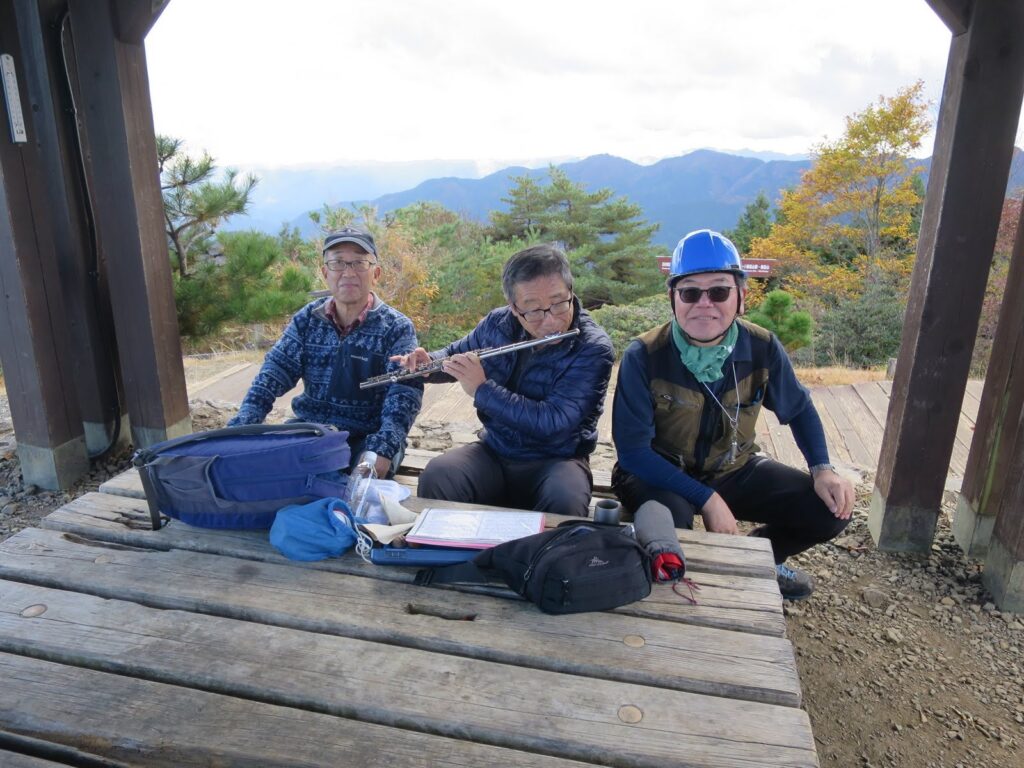 平坦で気持ちの良い尾根を歩いて12時半に日の出山山頂(902m)に着きました。この時には小雨も止み、東京都心やスカイツリーも見ることが出来ました。山頂には、東屋やベンチもあり、ランチとしました。ランチ後、恒例の芝田さんのフルート演奏をしばし楽しみ、全員の集合写真も撮りました。