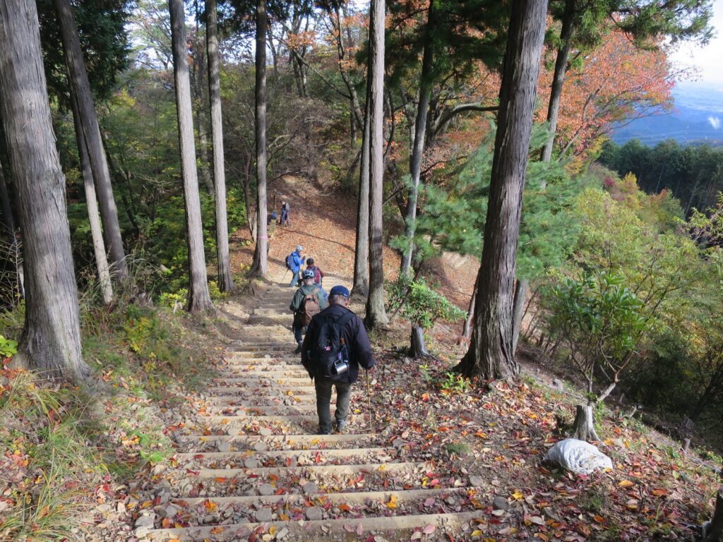 13時10分日の出山からつるつる温泉に向けて下山です。最初は階段、その後緩やかな下り道で紅葉を楽しみながらゆっくりと下っていきます。