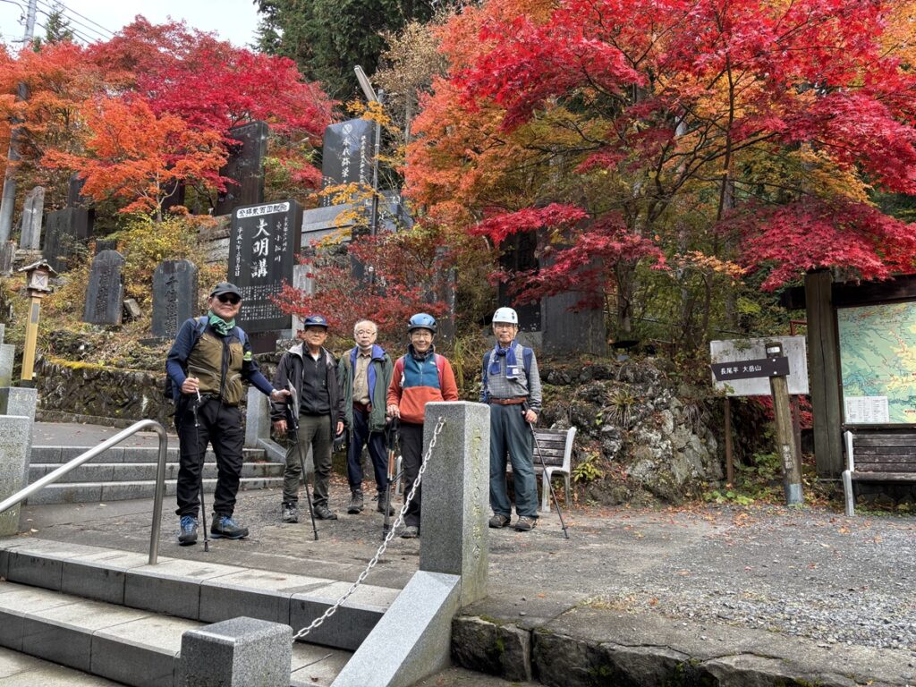 2025年11月10日(月)奥多摩の御岳山から日の出山を縦走しました。参加者は、4期漆戸さん、6期辻川さん、阪女OGの鈴木さん、13期小松崎さん、17期河野さん・半田さん、18期芝田さん・橘さん・佐野の9名です。9時45分に青梅線御嶽駅に集合しバス・御岳山ケーブルカーと乗り継いで一気に御岳山に向かいます。ケーブルカーは今年創業90周年とのことなので、滝本駅でケーブルカーと記念写真を撮りました。