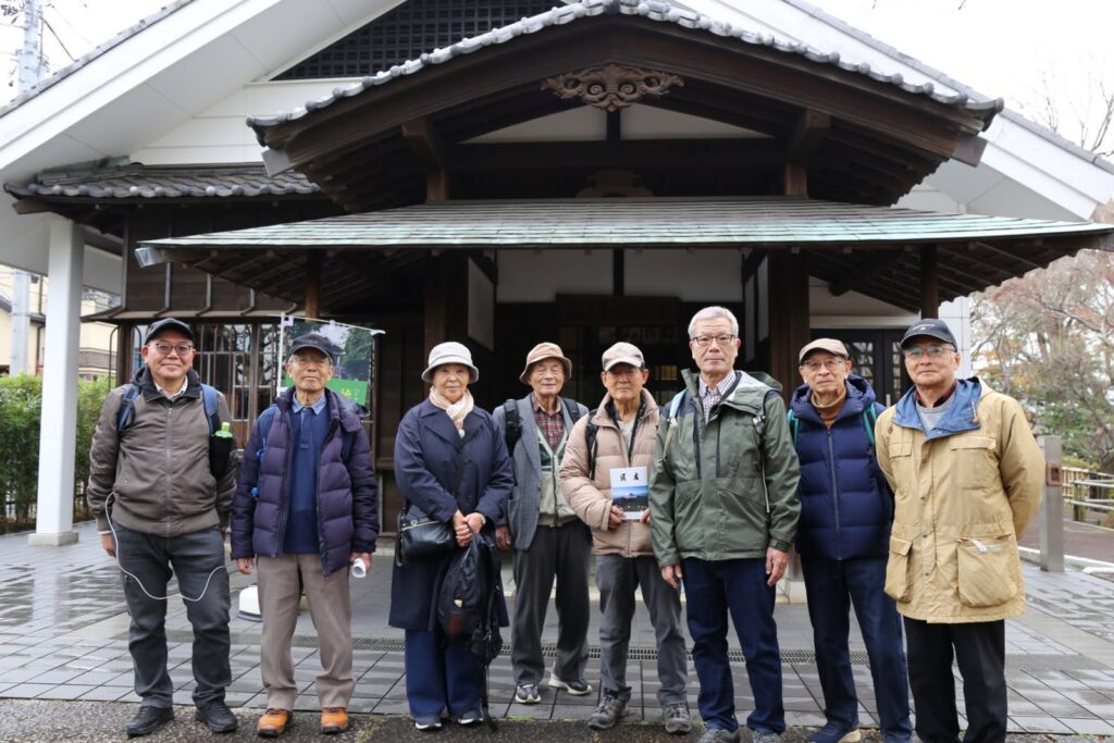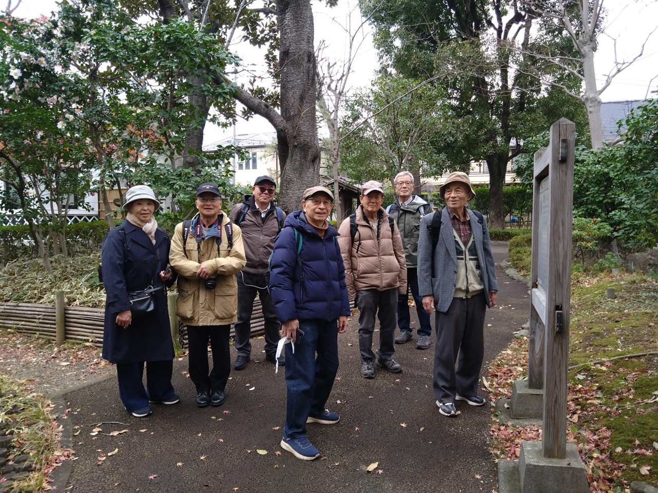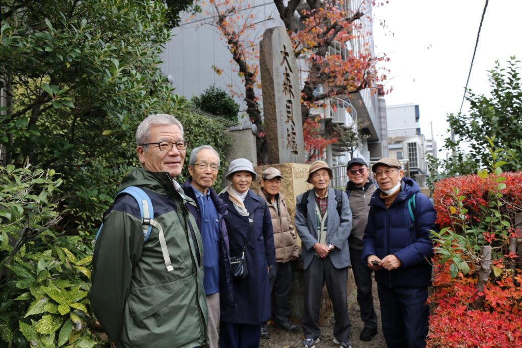 2025年12月20日(土)、忘年会前に平日会として大森・西大井界隈を歩きました。参加者は、4期漆戸さん・荒木さん、5期田中さん、6期辻川さん、13期小松崎さん、17期半田さん、18期阪本さん・佐野の8名です。12時過ぎに大森駅を出発し、大森貝塚を訪ねました。線路沿いに大森貝塚を発見したモース博士を顕彰した碑が立っています。
