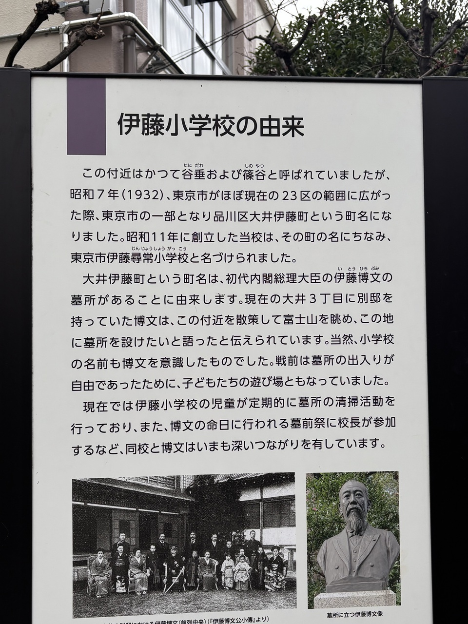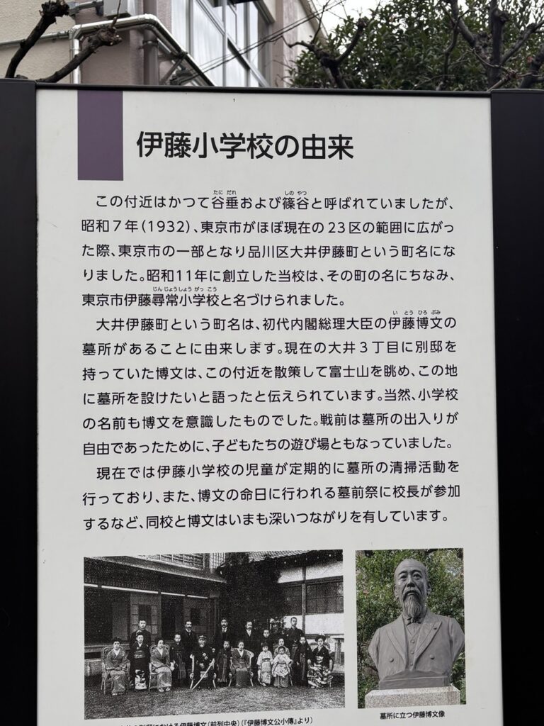 次に今年の正月の「荏原七福神」巡りで参拝者が多すぎて入れなかった日本三大白蛇神社の一つ「蛇窪神社(へびくぼじんじゃ)」に再挑戦ということで西大井に向かいました。西大井は初代内閣総理大臣の伊藤博文の居宅があったことからその名に由来する「区立伊藤小学校」がありました。