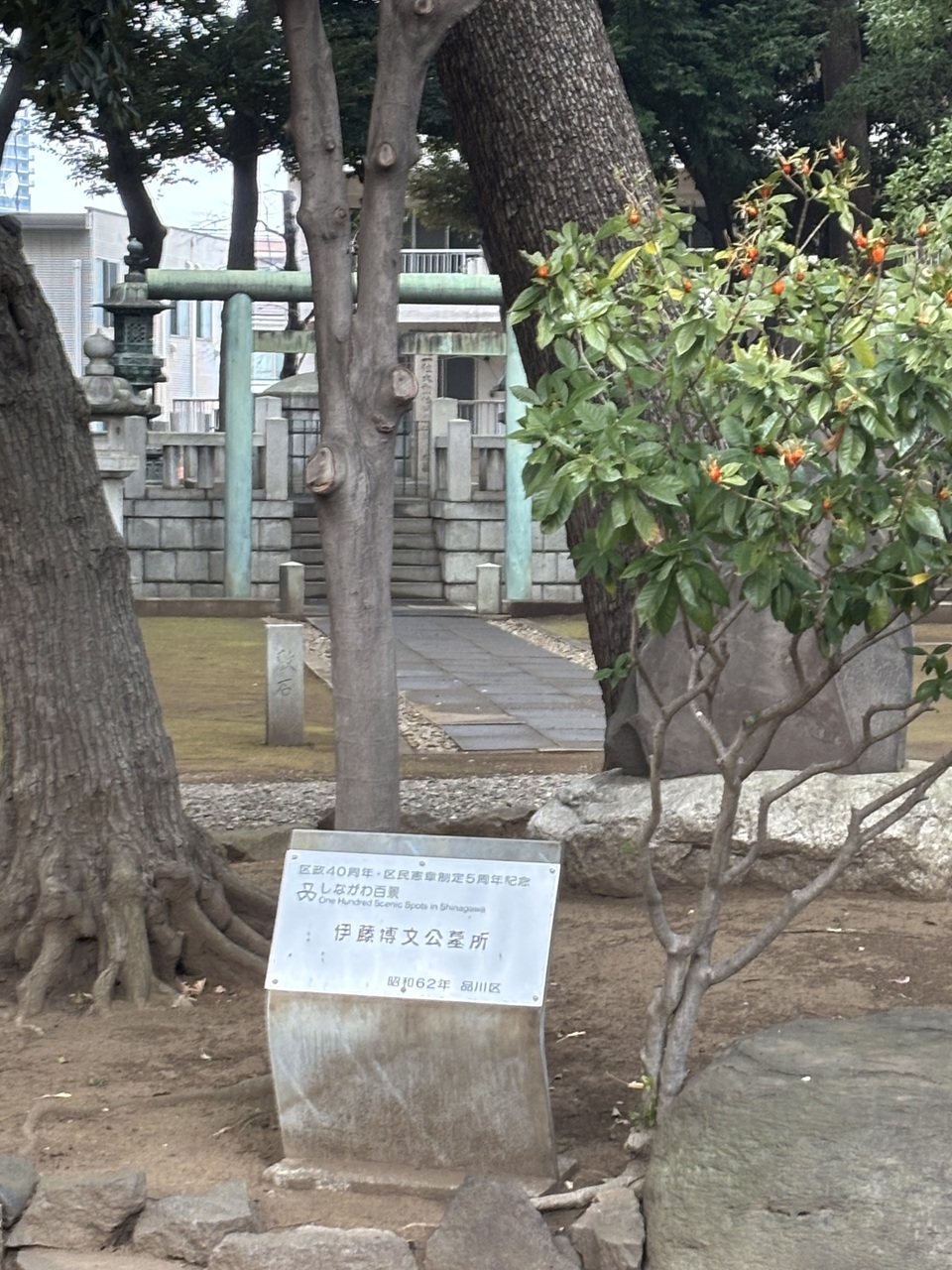 蛇窪神社を出て西大井駅を目指して歩きます。電車の時間も迫ってきておりましたが、駅近くの「伊藤博文の墓」にも立ち寄りました。高さ2mの円墳の前に鳥居を配した神式の墓所で隣に梅子夫人の墓があります。このあと、2時41分発の電車に乗り、品川駅港南口の忘年会場に向かいました。