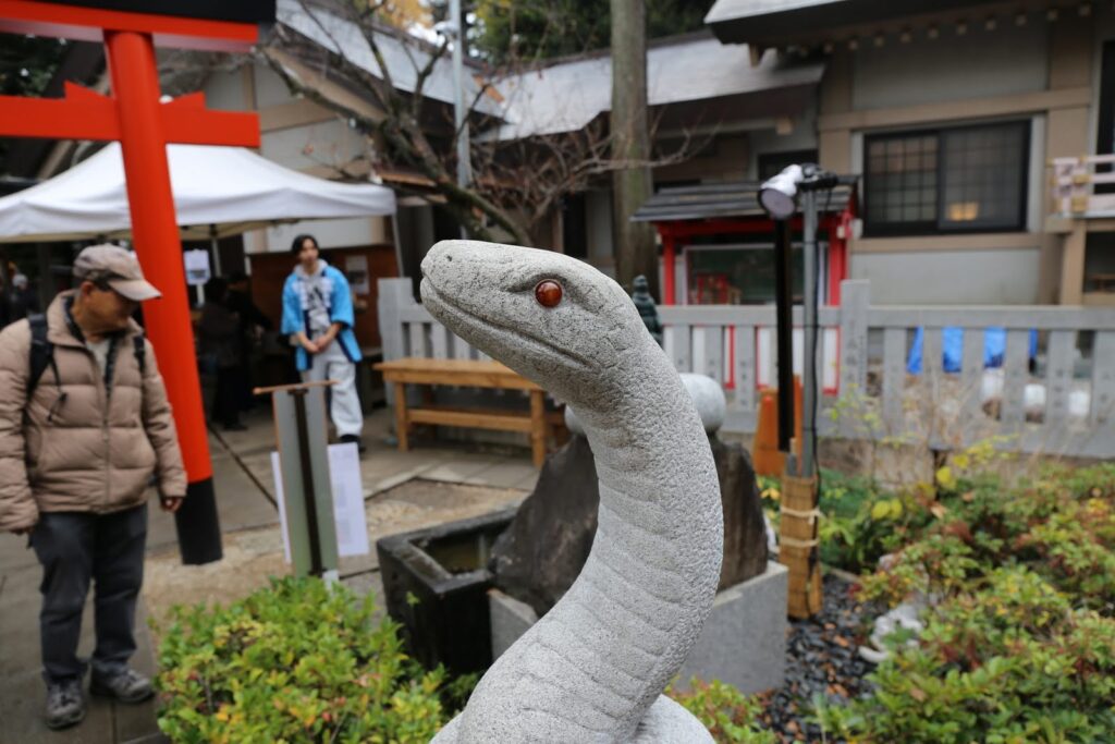 蛇窪神社は、白蛇様が祀られ、お参りをすることで金運上昇、立身出世といったご神徳を授かれるということでへび年には大人気です。さっそく銭洗いをして金運アップ、蛇窪竜神をお参りして「巳が龍(みがたつ)」=立身出世の御利益をいただきました。